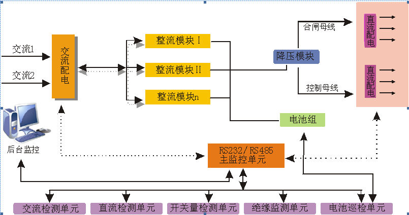 两路市电经过自动切换输入一路交流,给整流模块供电。整流模块将输入的交流AC转换为直流DC,给蓄电池充电,同时给合闸母线负载供电;另外合闸母线通过降压模块后给控制母线负载供电。系统中运行的各种功能模块受主监控和后台监控及远程监控的控制,监控可实时显示运行信息、查询信息及操控系统。系统除交流监控、直流监控、开关量监控等基础单元外,还可以配置绝缘监测、电池巡检等功能单元,用来对直流系统进行全面监控。