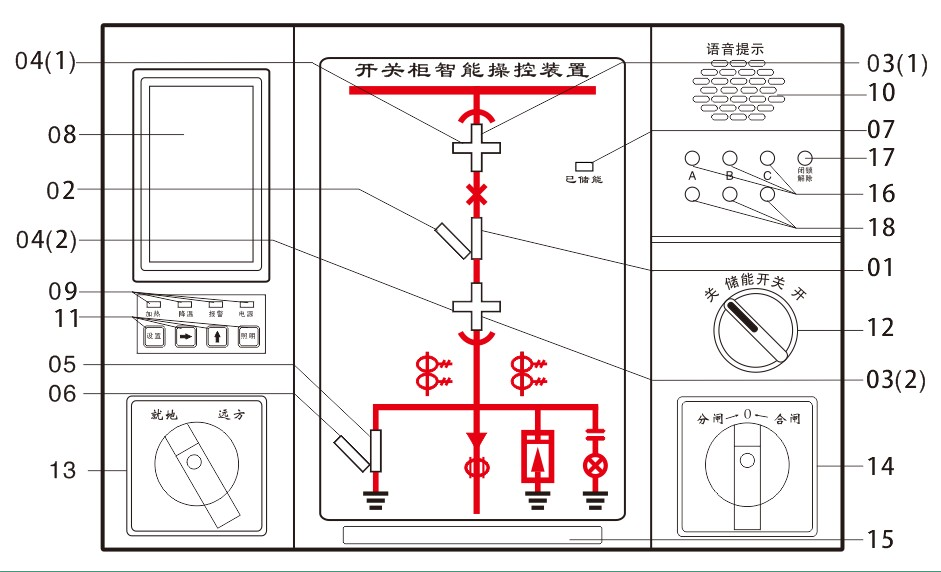 开关柜智能操控装置,产品功能强大,使用于3KV-35KV 户内开关柜,中置柜、手车柜、固定柜、环网柜等多种开关柜。具有动态一次模拟图、高压带电显示、自动加热除湿数据显示及控制、断路器分合状态指示、储能指示、接地开关状态指示、小车位置指示、分合闸回路完好指示、人体感应及柜内照明以及无线测温功能、语音防误提示等功能,可取代现有的一次回路模拟图、带电显示器、自动加热除湿控制器、断路器分合按钮等。并且具有RS485通讯接口,通讯协议为MODBUS通讯协议,能够使开关柜进一步智能化,网络化,数字化,方便广大用户使用与操作。